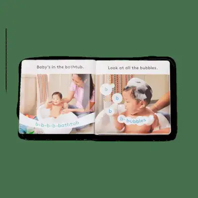 Crea un rituale del bagnetto con questo libro impermeabile che mostra un bambino che gioca nella vasca ed esercitati con i suoni delle prime lettere.