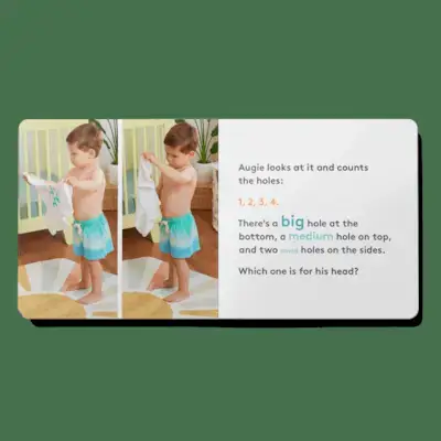 Ottieni i pacchetti di libriSappiamo cosa conta per tuo figlio: la giusta lunghezza, il giusto vocabolario, il giusto numero di parole per pagina e il tipo di fotografie ed elementi interattivi che coinvolgono ed emozionano. Dai volti dei bambini alle prime parole, all'apprendimento del vasino e alla creazione di un amico, i pacchetti di libri supportano un profondo apprendimento socio-emotivo e cognitivo.